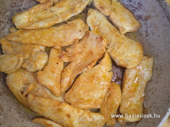 Az előző este bepácolt csirkemell szeleteket olíva olajon pirosra sütjük.