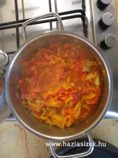 A pépes tejfölös lecsóba beletesszük az előzőleg kisütött csirkemelleket és pár percig együtt főzzük.