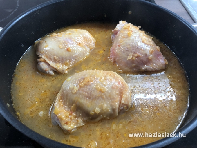 Ha már mindkét oldalát kicsit megkapattuk öntsük fel vízzel. Nem kell, hogy ellepje a csirkét. Mi jó szaftosan szeretjük, így én kicsivel több vizet szoktam hozzáadni. Ízlés szerint sózzuk, borsozzuk, majd lefedjük és fedő alatt puhára főzzük a húsokat.