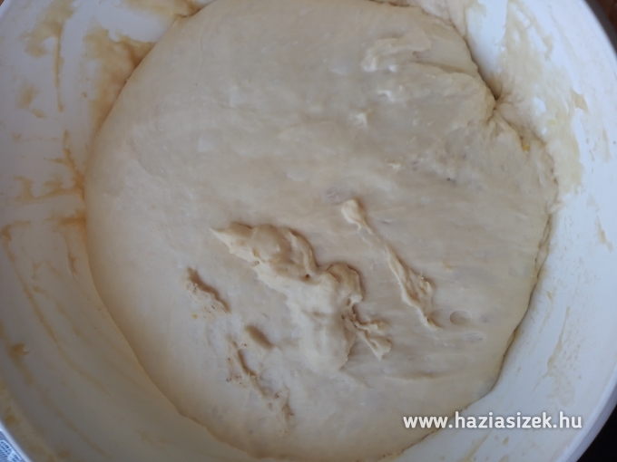 Ha a tészta elég sima, hólyagos, buborékos elválik a kelesztőtál falától, konyharuhával letakarom, meleg helyre teszem, 1/2-3/4 óráig hagyom kelni, míg a duplájára nem kel.