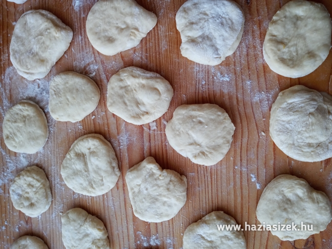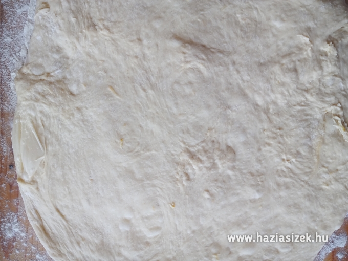 Ha már szépen megkelt a gyúródeszkára kiöntöm, kb. 2 cm vastagra elsodrom.