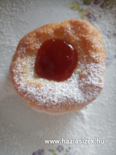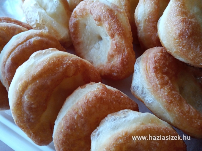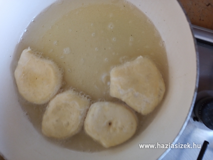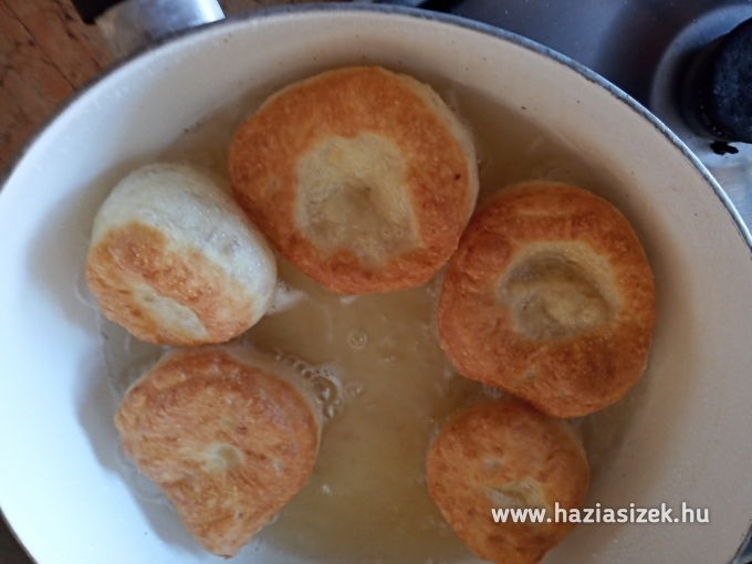 Mikor az olaj gyöngyözni kezd beleteszek egy fánkot próba képpen, hogy az olaj megfelelő hőmérsékletű-e? A fánkot úgy teszem az olajba, hogy a felső fele legyen alul a lábasban. Ha megfelelő meleg az olaj, a fánk hirtelen terebélyesedni fog. Így beletehetem a többit is. Olyan sokat ne tegyünk a lábasba mert ha megnőnek nem férnek el. Mikor beleteszem a lábasba fedőt teszek rá.