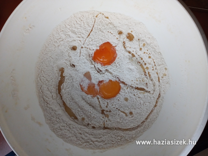 Hozzáadjuk a maradék cukrot, pici sót, a tojások sárgáját, az olajat és hozzáöntjük a megkelt élesztős tejet.