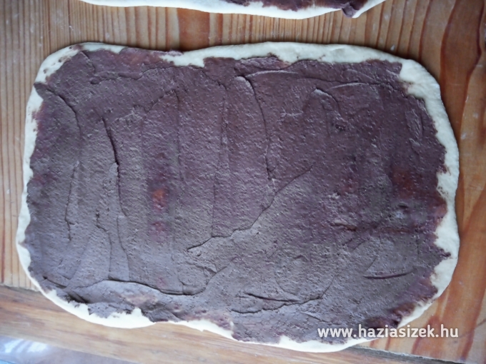 A kinyújtott téglalap alakú tésztát a kakaós krémmel megkenjük.