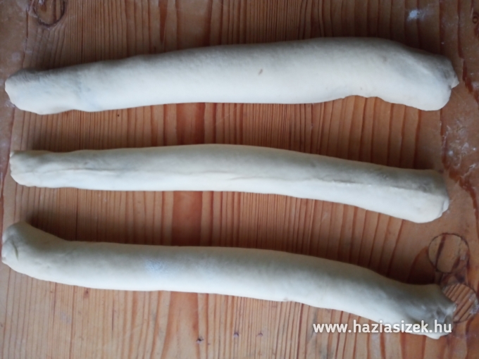 Ha a kalácstészta jól megkelt 6 egyenlő részre osztjuk. Cipókat formálunk melyeket egyenként téglalap alakúra (kb:12x25 cm) nyújtunk.